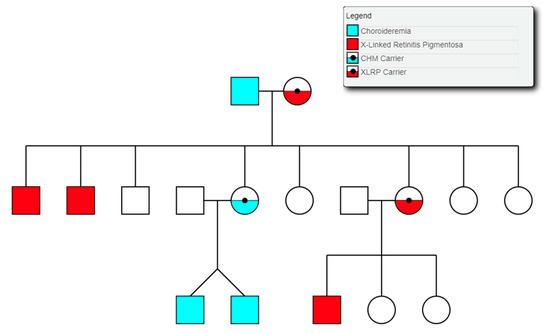 Partial pedigree tree illustrating the segregation of two X-linked retinal conditions within one family.