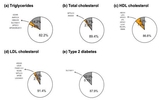 Contribution of common single nucleotide polymorphism (SNPs) to the genetic variance of lipid levels in Mexico. It is shown the variance explained by previously associated genes (yellow), as well as by environmental covariates (grey): age, sex, body mass index (BMI), ancestry and type 2 diabetes (T2D), specifically for lipid traits. In addition, the most associated genes with lipid levels (a–d) and T2D (e) in Mexican population are shown.