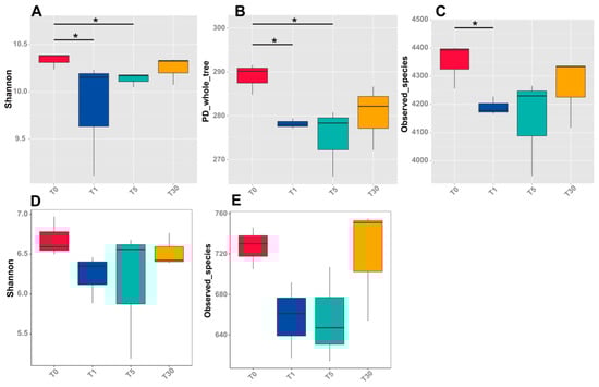Alpha-diversity of the bacterial and fungal communities for four groups of microbial samples. (A–C), representing Shannon diversity, PD_whole tree, and observed species of the bacterial community, respectively; (D,E), representing Shannon diversity and observed species of the fungal community, respectively. Significances between different groups were compared using Wilcoxon’s test, with the results indicated on the top (p-value ≤ 0.05 = *).