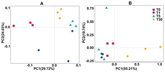 Beta diversity of the microbial community using principal coordinate analysis plots (PCoA) analysis with the weighted_Unifrac metric. (A) bacterial community; (B) fungal community.