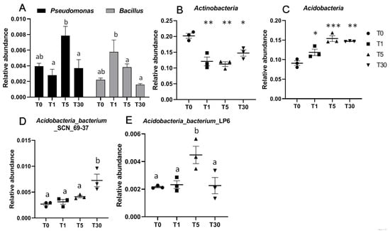 Here, we chose the two beneficial bacteria Pseudomonas and Bacillus, which have been studied in many investigations due to their ability to improve the growth of plants [,]. The relative abundances of these two beneficial bacteria in the four groups displayed significant differences for T1, T5, and T30. Specifically, the abundance of Pseudomonas was significantly higher in T5 than that in T1 and T30, while Bacillus was significantly higher in T1 than that in T5 and T30 (Figure 5a, Dataset S16). Compared to the abundance of Actinobacteria in the bulk soil (T0), the rhizosphere soils in T1, T5, and T30 were significantly much lower (Figure 5b). In contrast, the phylum Acidobacteria abundance was significantly increased in T1, T5, and T30 compared to that in T0 (Figure 5c). In addition, the phylum Acidobacteria abundance in T5 was much higher than that in T1. In this phylum, compared to other groups, T30 was significantly enriched in Acidobacteria bacterium SCN_69-37 and Cladosporium, while T5 was significantly enriched in Acidobacteria_bacterium_LP6 (Figure 5d,e).
