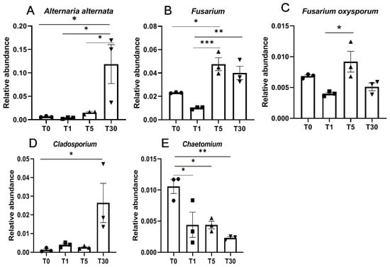 Relative abundance of beneficial and pathogenic fungi. (A,C) Pathogenic fungi species; (B,D) pathogenic fungi genera; (E), beneficial fungus. Significance between different groups were compared using a one-way ANOVA test, with the results indicated on the top (p-value ≤ 0.05 = *, p-value ≤ 0.01 = **, and p-value ≤ 0.001 = ***).
