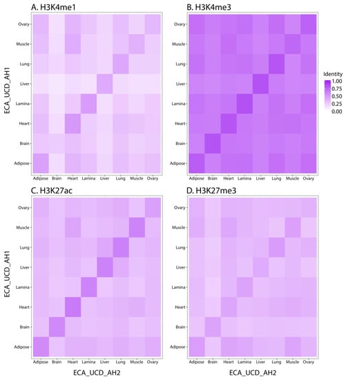 Using the Jaccard Index to compare replicates for all of the marks, we found the highest identity between the two replicates of the same tissue (Figure 1), with the exception of the brain replicates for H3K4me1 and the ovary replicates for H3K27me3. For the brain replicates, ECA_UCD_AH2 had 65,327 peaks compared to 143,328 peaks for ECA_UCD_AH1 (Table 3). In addition to a lower peak number, two of the library complexity quality scores for the ECA_UCD_AH2 brain replicate were lower than the ENCODE quality thresholds (Table 4). In terms of enrichment, however, the cross-correlation metrics for this sample were both above the established thresholds and indicate that the data had sufficient ChIP enrichment. Indeed, we were able to call 95,918 combined peaks, which is consistent with the range of H3K4me1 values from the other tissues. For the ovary replicates, two of the three library complexity metrics were below ENCODE standards, yet all of the ChIP enrichment metrics were consistent with those for the broad mark in other tissues, indicating that we had sufficient ChIP enrichment despite lower library complexity. When comparing SICER and MACS2 peak-calls for the broad mark, the number of combined peaks (8479 and 40,825, respectively) and the percentage of the genome covered (2.1% and 1.2%, respectively) for ovary were all consistent with the same measures for the H3K27me3 peaks from the other tissues evaluated in this study.