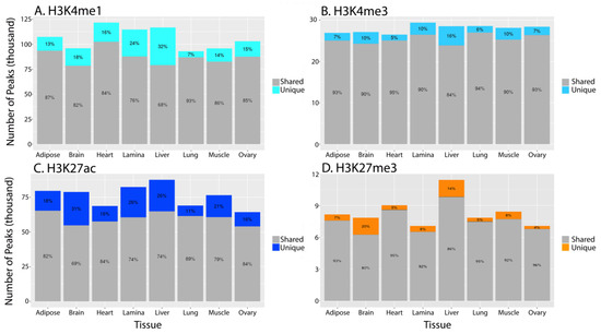 Tissue-specific peaks for each histone mark. Grey area indicates the number of peaks for a particular histone tail modification that are shared between at least two tissues, while the color region of each bar indicates the number of tissue-specific peaks. Percentage values are also assigned to the two segments of each bar to indicate the proportion of shared and unique peaks. (A) H3K4me1, (B) H3K4me3, (C) H3K27ac, (D) H3K27me3 from SICER.