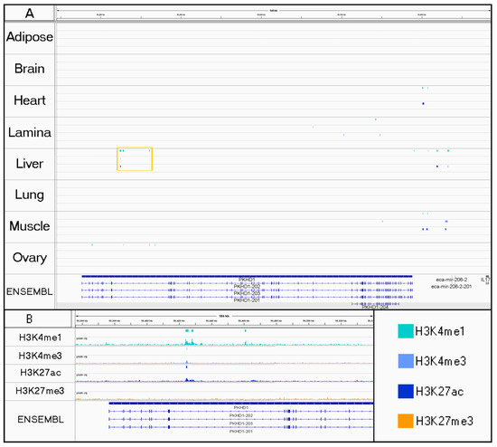 Evidence of a tissue-specific regulatory element found in liver tissue. For each tissue, peaks are displayed for H3K4me1 (aqua), H3K4me3 (light blue), H3K27ac (dark blue), and H3K27me3 from SICER (orange). (A) Gold box highlights liver-specific active marks in the 59th intron of an annotated gene, PKHD1 (Ensembl Transcript ID: ENSECAT00000024985.1), which is transcribed from the antisense strand. H3K4me1 marks were also detected in ovary tissue at the end of the gene, but they do not indicate the presence of an active enhancer without co-occurrence of H3K27ac. (B) Enrichment profiles (BigWig) were visualized below the corresponding peak tracks for the region highlighted by the gold box in A.