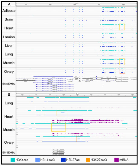 Visualizing tissue-specific peak-calls using the Integrated Genome Viewer. For each tissue, peaks are displayed for H3K4me1 (aqua), H3K4me3 (light blue), H3K27ac (dark blue), and H3K27me3 from SICER (orange). Gold boxes highlight active marks associated with promoters (H3K4me3) in both muscle tissues (skeletal and cardiac) for an unannotated ncRNA, LOC111775680 (ENSECAT00000049354), and red box highlights an H3K4me3 peak specific to ovary tissue. (B) Zoomed in view of (A) for relevant tissues with RNA expression shown in purple. While ovary also appears to have a peak in H3K4me3 nearby, it does not have expression of the lncRNA based on mRNA expression from these tissue samples.