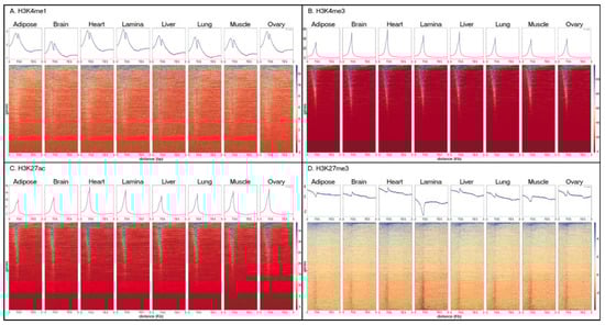 The following are available online at https://www.mdpi.com/2073-4425/11/1/3/s1: Figure S1. Jaccard Index to measure similarity of peaks called for H3K27me3 peaks based on either MACS2 or SICER peak-calling; Table S1. Concentrations and catalog numbers for antibodies used during ChIP; Table S2. Quality metrics, peak-calling summary, and comparison to Encyclopedia of DNA Elements (ENCODE) data from quality control (QC) testing; Table S3. Comparing peak numbers to ENCODE data; Table S4. Motif and gene ontology (GO) term analysis results for adipose-specific active enhancers; Table S5. Motif and GO term analysis results for adipose-specific active promoters; Table S6. Motif and GO term analysis results for brain-specific active enhancers; Table S7. Motif and GO term analysis results for brain-specific active promoters; Table S8. Motif and GO term analysis results for heart-specific active enhancers; Table S9. Motif and GO term analysis results for heart-specific active promoters; Table S10. Motif and GO term analysis results for lamina-specific active enhancers; Table S11. Motif and GO term analysis results for lamina-specific active promoters; Table S12. Motif and GO term analysis results for liver-specific active enhancers; Table S13. Motif and GO term analysis results for liver-specific active promoters; Table S14. Motif and GO term analysis results for lung-specific active enhancers; Table S15. Motif and GO term analysis results for lung-specific active promoters; Table S16. Motif and GO term analysis results for muscle-specific active enhancers; Table S17. Motif and GO term analysis results for muscle-specific active promoters; Table S18. Motif and GO term analysis results for ovary-specific active enhancers; Table S19. Summary of the GO term analysis results for unique active elements from all tissues.