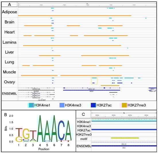In addition to health and performance, these annotation data can also be used to identify important genomic regulatory regions for the reproductive system. Previously, homology with humans and mice was utilized to create a panel of candidate regions for determining the genetic cause of gonadal dysgenesis disorders across many breeds of horses [65], yet the panel was focused on coding variants and those within untranslated regions that may affect RNA and protein synthesis. By evaluating histone marks, we found that there are additional regulatory regions relevant to the reproductive system that were missed by the homology-based approaches. For example, NR5A1, a gene that is implicated in many dysgenesis cases [52,66], has a regulatory region as identified by H3K4me1 and H3K27ac histone modifications in equine ovary tissue that is characteristic of an active enhancer (Figure 7A). Upon further inspection, we identified two FOXO3 binding sites within the region enriched with peak-calls (Figure 7B,C). FOXO3 is a transcription factor with known roles in oocyte maturation [GO:0001556] and ovulation [GO:0001542] that was identified as an ovary-specific TF based on our motif analysis (Table S18).