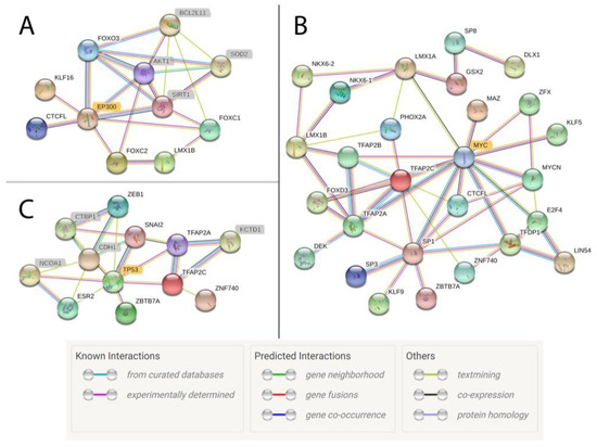 Network of transcription factor interactions based on active motif regions in ovary, skeletal muscle, and lung tissues. Each circle represents a protein, and lines indicate interactions between proteins. Each line color indicates a different type of evidence for the interaction. Protein names highlighted in grey were not identified in the horse ChIP-seq data but were identified as secondary factors by the network analysis based on implicated or known protein–protein interactions from research in humans and mice. (A) EP300 is highlighted in gold to denote its central role in the network for ovary tissue. (B) MYC is highlighted in gold to indicate its central role in the network for muscle tissue. (C) TP53 is highlighted in gold to indicate its central role in the network for lung. Legend is from String Software [47].