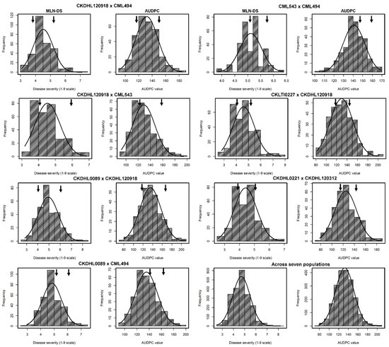 Phenotypic distribution of MLN disease severity (MLN-DS) and the area under disease progress curve (AUDPC) values recorded in seven individual and across F3 populations. Arrows indicate the performance of parents.