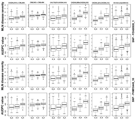 Among several genomic regions identified with stable QTL for MLN resistance, QTL on chromosome 3 was highly consistent. We found two strongly associated SNPs (PHM15449_10 at 125,077,922 bp and PZA00920_1 at 142,821,031 bp) within this region and their allelic effects on MLN resistance in different populations were also prominent. The phenotypic values of the different allele classes of these two major-effect SNPs in five F3 populations and across populations for MLN-DS and AUDPC value were presented in Figure 3.