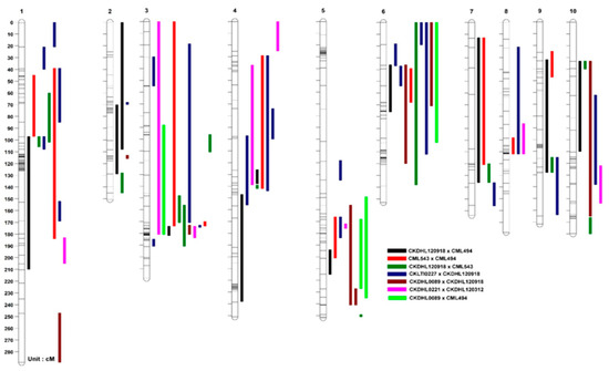 QTL mapping approaches are one of the popular genomic tools to dissect the genetic architecture of complex traits [4]. The presence of QTL conferring resistance to several viral diseases in maize has been investigated in numerous linkage and linkage disequilibrium mapping studies [4,5,6,7,8]. QTL mapping or linkage mapping is known for high QTL detection power. Joint linkage association mapping (JLAM) based on different segregating biparental populations is known to provide both the high QTL detection power and high mapping resolution [9,10]. Application of both linkage mapping and JLAM in multiple bi-parental populations is useful to validate earlier findings and to detect possible new sources of resistance for MLN.