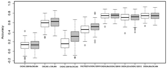 Box-whisker-plots for the accuracy of genomic predictions assessed by five-fold cross-validation within each population for MLN-DS (white box) and AUDPC values (grey box).