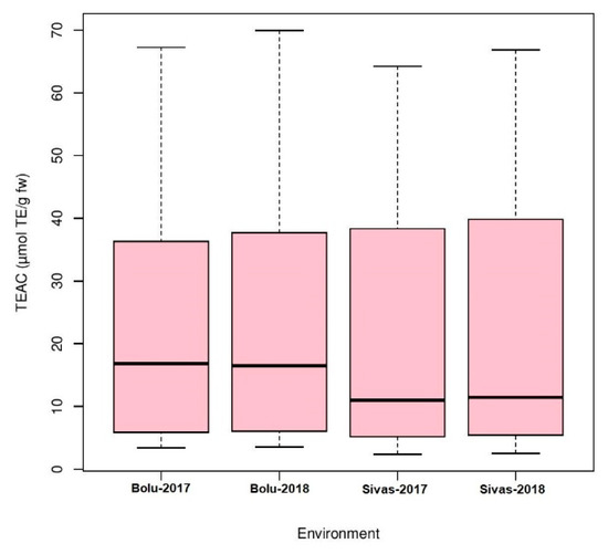 Analysis of variance (ANOVA) was performed for four environments to understand the effects of genotype, environment, and the interaction of both (GEI) for antioxidant activity in Turkish common bean germplasm (Table 1). Genotypic effects were found to be statistically significant at (p < 0.05; F value 11.9), while GEI was statistically non-significant for antioxidants activity in this study. Heritability analysis revealed the existence of higher heritability (0.92) (Table 1). Antioxidant activity was evaluated as TEAC for each environment for both locations (Table S2). At BAIBU in 2017, the mean TEAC for common bean landraces was 19.78 ranging 1.8 (Hakkari-65) to 67.2 (Balikesir-19) (Table S3). At the same location in 2018, 20.25 was the mean TEAC, while 1.9 (Hakkari-65) and 69.9 (Balikesir-19) were the minimum and maximum TEAC, respectively. At the Sivas location in 2017, mean TEAC was 19.65, while minimum and maximum TEAC reflected by Hakkari-65 and Bitlis-22 landraces were 2.4 and 64.3, respectively. Mean TEAC was 20.43 at Sivas location during 2018, while minimum and maximum TEAC reflected by Hakkari-65 and Bitlis-22 landraces were 2.5 and 66.8, respectively. Overall mean TEAC in Turkish common bean landraces was 20.03, ranging from 32.15 (Hakkari-65) to 60.48 (Balikesir-19). Mean TEAC in common bean cultivars at Bolu in 2017 and 2018 were 13.9 and 14.3, respectively (Table S3). Mean TEAC in common bean cultivars at Sivas in 2017 and 2018 were 15.7 and 16.3, respectively, while overall mean TEAC in common bean cultivars during the whole period of study was 15.1. Boxplot analysis also confirmed the results of ANOVA by revealing that there are no significant environmental effects on the seed antioxidant contents (Figure 2). Frequency distributions for TEAC in common bean are presented in Figure 3, which shows that most of the landraces have less than 10 µmol TE/g TEAC. Mean antioxidant activity in the colored seeds and white seeds were 30.04 and 16.22 µmol TE/g TEAC, respectively. Correlation analysis between antioxidant activity and seed caot colors was also performed, which revealed a negative correlation of antioxidant activity with white seeds (Table 2).