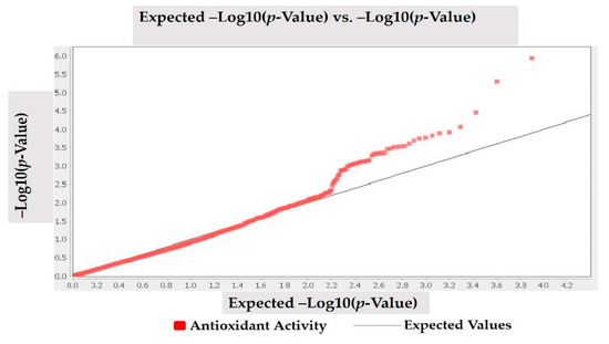 MLM (Q + K) model was applied to investigate marker-trait association for antioxidant activity in studied Turkish common bean germplasm. MLM based on Q + K model showed that out of 7900 DArTseq markers, only four markers (DArT-3369938, DArT-8668387, DArT-8207664, and DArT-3371498) reflected statistically significant association for antioxidant activity (Table 4; Figure 4). The phenotypic variation percentage (R2) reflected by each marker ranged between 0.094% to 0.156% for DArT-3371498 and DArT-3369938, respectively. The p-value of each marker reflecting significant level of association between marker and antioxidant activity is presented in the form of Manhattan plots (Figure 4). Manhattan plots showed that markers associated with antioxidant activity are present on chromosomes 3 and 7. Quantile-quantile (q-q) plot (Figure 5) reflected the goodness of fit of the best model by implementing p-value distributions (expected vs. observed p-values on a -log10 scale).