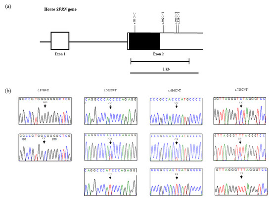 3.1. Investigation of Polymorphisms of the SPRN Gene in 194 Thoroughbred Horses
