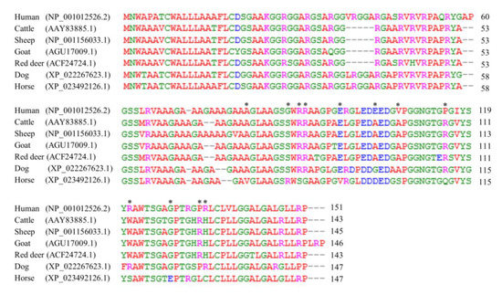 | Red deer | Cervus elaphus | ACG274724.1 | Not found | A65–A67, A77–S79 | 2 |
