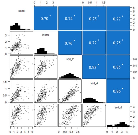 Summary of the phenotypic variations of mesocotyl length among different culture conditions, including correlations between mesocotyl lengths under different culture conditions and mesocotyl length distribution under varied culture conditions. Soil_2: soil culture with 2 cm sowing depth; Soil_4: soil culture with 4 cm sowing depth; Soil_6: soil culture with 6 cm sowing depth, numbers in blue boxes are correlation coefficients (r), * indicates the significance at p ≤ 0.05.