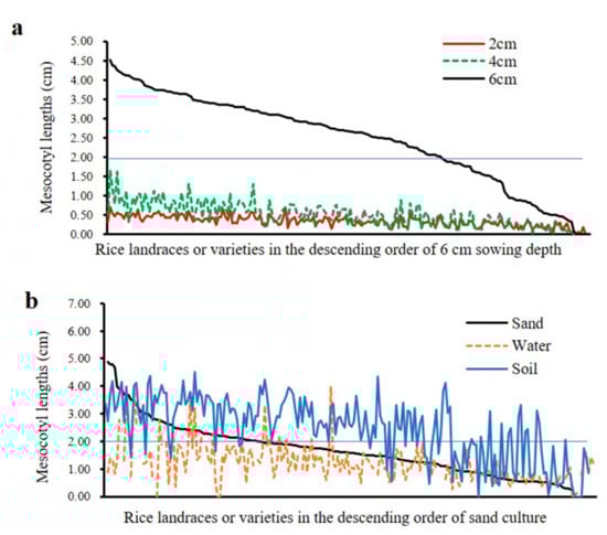 The elongation of mesocotyl was influenced by various environmental factors, such as light, temperature, moisture [28,29]. Thus, rice mesocotyl elongation were varied among different culture media, such as soil [26], sand [17], water [30]. In our study, mesocotyl length ranged from 0 to 3.99 cm under water culture, which was close to 0-5.05 cm in a previous study [17]. While, the mesocotyl length under 6 cm sand culture ranged from 0 to 4.88 cm, which differed from the previous result ranging from 0 to 2.05 cm under 5 cm sand culture [17]. Moreover, more than half of the 208 accessions had mesocotyl length longer than 1 cm under water culture. However, Wu et al. (2015) reported that only 10.5% accessions had mesocotyl length longer than 1 cm under water culture [17]. It is probably that the diverse results were mainly caused by different genotypes. Previous studies suggested that under varied sowing depths of soil cover, mesocotyl length was promoted by the depth in soil culture [11,18,26]. Lee et al. (1999) also reported that mesocotyl length under 3-cm sowing depth was shorter than that under 5-cm sowing depth [31]. Similarly, our results showed that mesocotyl length had a large variation among sowing depth, with an order of 6 cm > 4 cm >2 cm in soil. These results indicated that the variation of mesocotyl length existed in varied culture media and sowing depths.