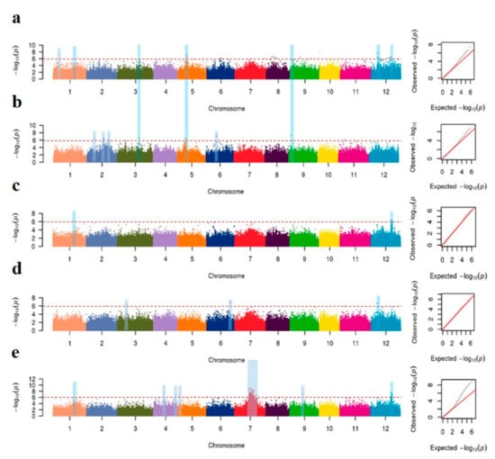 Genome-wide association studies for mesocotyl length among three culture media. Manhattan plots and Quantile-quantile plots of mesocotyl lengths in sand culture (a), water (b) and soil culture with a sowing depths of 2 cm (c), 4 cm (d) and 6 cm (e), respectively. Negative log10-transformed p values from a genome-wide scan are plotted against position on each of 12 chromosomes. The red horizontal dashed lines indicate the genome-wide significance threshold. Blue stripes show important signals in different GWAS.