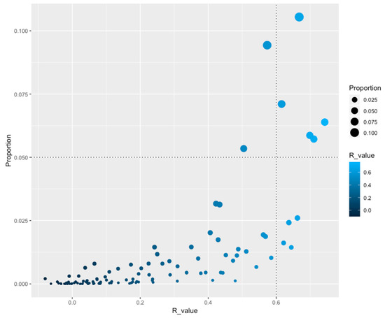Proportion of TFs(Transcription factors) as a function of R-values. On the X-axis is the indicated the R-value (Pearson correlation) between the genome size and the number of proteins per family of TFs. On the Y-axis is the proportion of TFs versus the dataset. An R-value ≥ 0.6 was considered significant (vertical dotted lines at 0.6). A value ≥ 0.050 was considered as abundant (horizontal dotted lines). Circle size denotes the proportion of the families and color the R-value.