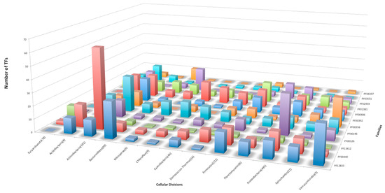 Families identified with more than 10 members (on average) per cellular division. The Y-axis shows the number of TFs, and the X- and Z-axes indicate the cellular division and family ID, respectively.