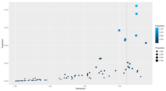 Distribution of TF families among all the genomes. The X-axis indicates the distribution (as a percentage) of genomes with members of a given family. 0 represents absence of a family and 1 means that a family is distributed along all the organisms. The Y-axis indicates the proportion of families versus the total of TFs identified. The vertical dotted line indicates those families identified in more than 80% of organisms.