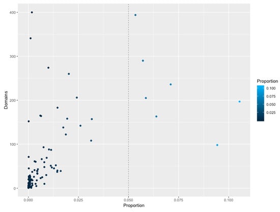Number of NR domains associated with TF families. The X-axis indicates the proportion (as a percentage) of abundance of a given family versus the total of TFs. The Y-axis indicates the total number of non-redundant domains per family. The dotted line indicates the most abundant families.