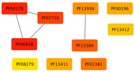 To determine how the families are distributed among the complete collection of bacterial and archaeal genomes and to determine if there are families that are universally distributed, the distributions of the 111 PFAMs were traced along the 1321 genomes, and their rates of occurrence were calculated, considering the rate of total presence of a PFAM against the total number of organisms. Therefore, a value close to 1 indicates that the family is present in 100% of the organisms, whereas a value near 0 indicates that the family is absent in all the organisms. Table 1 and Figure 3. From this distribution, a set of 12 families were considered universally distributed, because they were found as in at least 80% of the total organisms, and they could be considered the basic core of regulators associated with prokaryotes. In this dataset, the following families were identified: HTH_3 (PF01381), Bac_DnaA_C (PF08299), Bac_DNA_binding (PF00216), Fur (PF01475), HTH_5 (PF01022), MerR_1 (PF13411), HTH_Crp_2 (PF13545), HTH_24 (PF13412), MarR (PF01047) and TetR_N (PF00440), HTH_1 (PF00126), and Trans_reg_C (PF00486). The rest of the families identified in all the genomes can be interchanged or lost among the bacteria and archaea as a consequence of their lifestyles. In general, the set of universal families is comprised of highly abundant groups, as TetR (highly abundant) and those that are not necessarily the most abundant ones, suggesting that families with a small number of members are also fundamental for the regulation of basic processes, such as ferric uptake regulator Fur, that connects iron transport and utilization enzymes with negative-feedback loop pairs for iron homeostasis [21]; Fur has been identified across a large diversity of organisms [22,23,24]. Similarly, DnaA is involved in initiation of chromosomal replication [25], a fundamental process of all organisms; or LexA-like proteins, with a wide distribution along the bacteria and archaeal genomes, suggesting that the SOS response might be a universal adaptation of bacteria to DNA damage [26]. This distribution, together with the probable coevolution of the LexA recognition domain and its binding motif [27], indicates that the regulated genes must also contain a conserved binding motif in the upstream regions. In summary, we suggest a probable scenario concerning the distribution of universal or widely distributed families, with a conservation of the regulated genes such as the SOS regulon and LexA, with few probable recruitments of additional TFs to regulated regulons, such as occurs in the evolution of regulatory networks [28].