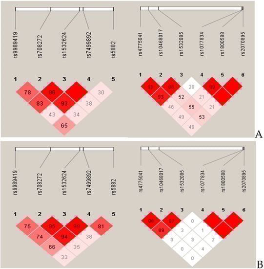 The blocks were formed by the SNPs of the CETP and LIPC genes. The numbers above the map show the rs numbers of SNPs. The color scheme is a standard Haploview color scheme (white D′ < 1 and LOD < 2, shades of pink/red: D′ < 1 and LOD ≥ 2, and bright red D′ = 1 and LOD ≥ 2). Numbers in the squares are D′ values.