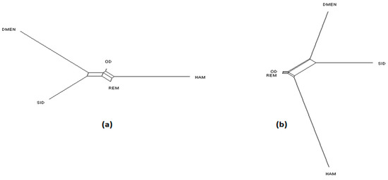 NeighborNet graph considering Algerian sheep breeds, from a matrix of Reynolds’ distances. (a) Plot obtained from the microsatellite dataset; (b) plot obtained from the single nucleotide polymorphism (SNP) dataset. For breed names see codes in Table S1.