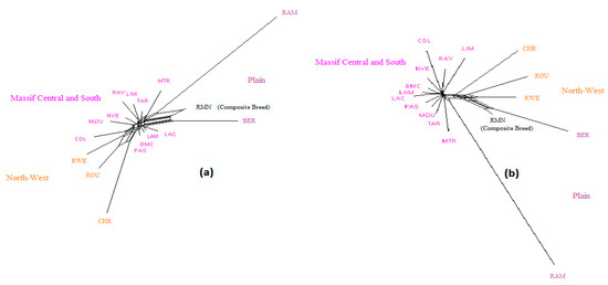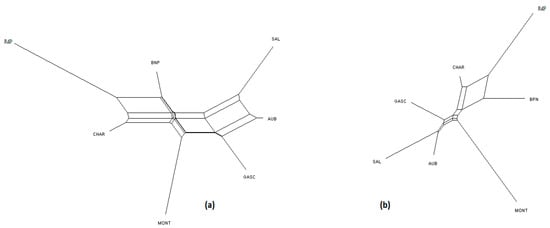 NeighborNet graph considering French cattle breeds, from a matrix of Reynolds’ distances. (a) Plot obtained from the microsatellite dataset; (b) plot obtained from the SNP dataset. For breed names see codes in Table S1.
