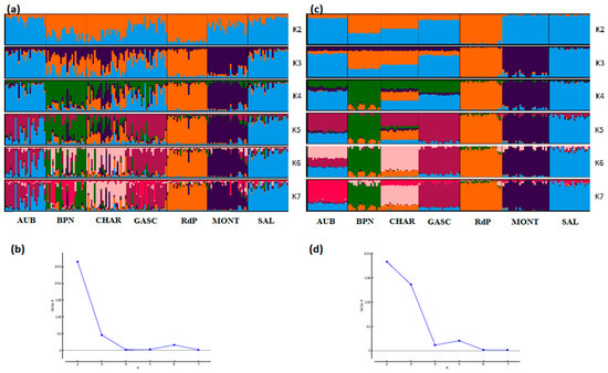 Genetic structure of Algerian sheep breeds by Bayesian analysis (K = number of clusters). (a) STRUCTURE plot obtained from the microsatellite dataset; (b) graph showing ΔK calculated according to [42] for the microsatellite dataset; (c) STRUCTURE plot obtained from the SNP dataset; (d) graph showing ΔK calculated according to [42] for the SNP dataset. For breed names see codes in Table S1.