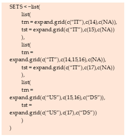 Example of a code snippet instructing the creation of training and testing sets. The list called ‘SETS’ contains three different training-testing (TRN-TST) sets. The IT14, IT15, IT16, and IT17 are four S. bicolor trials containing same genotypes evaluated in 2014, 2015, 2016, and 2017, respectively. The first set will train the model using as TRN set IT14 to predict IT15. In the second scenario, the model will be trained in IT14 + IT15 + IT16 to predict IT17, while in the third scenario, the model will be trained in US15DS + US16DS to predict US17DS.
