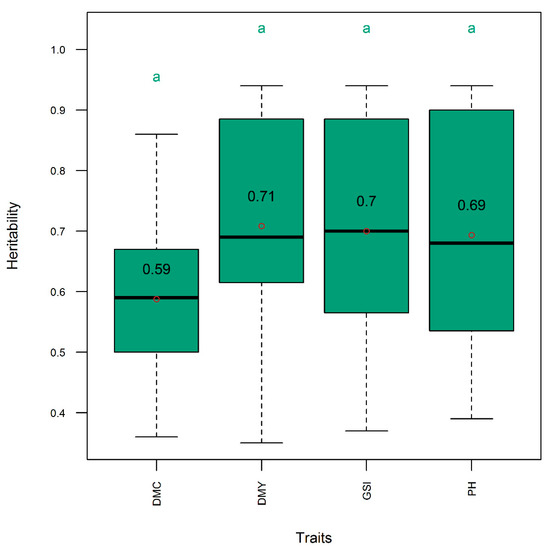 Distribution (boxplot) of narrow-sense heritability for single trait and three-trait selection indices in the entire panel. DMC, DMY, GSI, and PH, respectively, denote selection indices relative to dry mass fraction of fresh material, aboveground dry biomass yield, three-traits (DMC, DMY, and PH), and plant height. Means are indicated by open dots and are included within the boxplot. Means with same letter are not significantly different at the 5% level using the Tukey′s HSD (honestly significant difference) test. Refer to text for the description of the GS models.