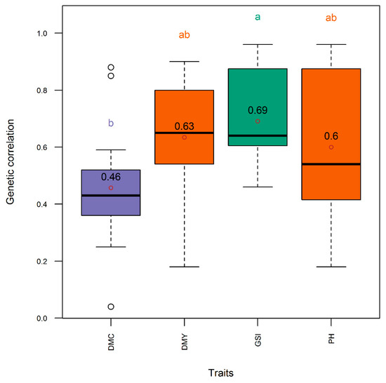 Distribution (boxplot) of genetic correlation between the phenotypic indices and the net genetic merit in the entire panel. DMC, DMY, GSI, and PH, respectively, denote selection indices relative to dry mass fraction of fresh material, aboveground dry biomass yield, three-trait (DMC, DMY, PH), and plant height. Means are indicated by open dots and are included within the boxplot. Means with same letter are not significantly different at the 5% level using the Tukey’s HSD (honestly significant difference) test. Refer to text for the description of the GS models.