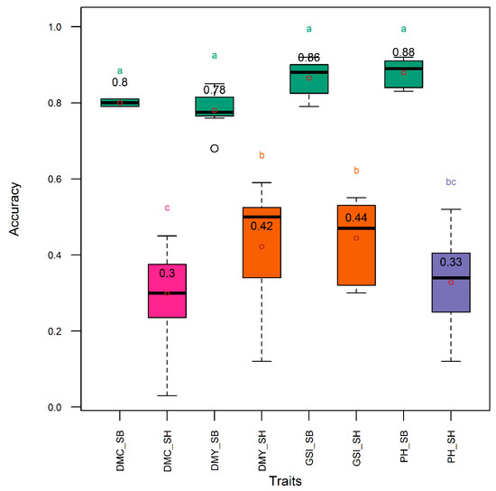 Distribution (boxplot) of genomic selection accuracy using single traits and all traits simultaneously in Sorghum bicolor and S. bicolor × S. halepense lines. DMC, DMY, GSI, and PH, respectively, denote selection indices relative to dry mass fraction of fresh mass material, aboveground dry biomass yield, all the three traits simultaneously, and plant height. Traits suffixed with “_SB” and “_SH”, respectively, were collected from Sorghum bicolor and S. bicolor × S. halepense lines. Means are indicated by open dots and are included within the boxplot. Means with same letter are not significantly different at the 5% level using the Tukey’s HSD (honestly significant difference) test. Refer to text for the description of the GS models.