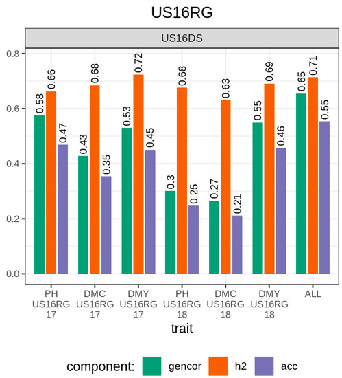 Accuracy of genomic prediction of the performance of S. bicolor × S. halepense regrown from rhizomes (testing set) using trials grown from seeds as training set. US16DS S. bicolor × S. halepense sown and evaluated in 2016; US16RG17 S. bicolor × S. halepense sown in 2016 and regrown and evaluated in 2017; US16RG18 S. bicolor × S. halepense sown in 2016 and regrown and evaluated in 2018. DMC, DMY, ALL, and PH, respectively, denote selection indices relative to dry mass fraction of the fresh material, aboveground dry biomass yield, all the three traits simultaneously, and plant height. Numbers on the top of the bars are mean accuracies. Refer to text for the description of the GS models.