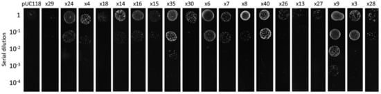 The genetic determinants positive in the Cd resistance test were then annotated. (Figure 3). These positive clones contained a LuxR family transcriptional regulator gene, a 5′–3′ exonuclease gene, a response regulator gene, two Type VII secretion genes, a threonine/serine exporter family gene, a γ -glutamyltransferase gene, and a hypothetical gene. Previous studies found that the Lux protein family was associated with metal resistance [], however, the function of the LuxR family transcriptional regulator is still unclear. The clones x3, x4, and x18 contain a unique ORF that improved Cd resistance of E. coli. This ORF encodes a protein which is similar to a polymerase/histidinol phosphatase-like hypothetical protein from Cyclobacterium qasimii []. The γ -glutamyltransferase gene ggt carried by x40 encodes a glutathione (GSH) metabolism related protein/enzyme, whose function has been well studied in E. coli strain K12 []. It is worthy to note that GSH has been reported to play a role in Cd tolerance in a variety of cells [,,,,]. These positive clones were further re-transferred into E. coli, and functional screening showed that most of these clones improved the growth of the hosts relative to the control (Figure 4). Among them, clone x9 showed the strongest resistance to Cd, and was able to survive with a rather low initial inoculum concentration (10−4). This suggests that these clones obtained from in vivo amplification are biologically functioning and convey Cd resistance to E. coli.