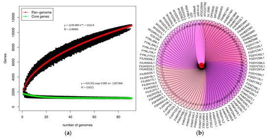 Pan-genome and core-genome of L. ruminis. (a) The pan-genome represented by the accumulated number of new genes against the number of genomes added. The core-genome represented by the accumulated number of genes attributed to the core-genomes against the number of added genomes. The mathematical functions of the pan- and core-genome based on 91 strains of L. ruminis are also shown on the graph; (b) Venn diagram of homologous genes of L. ruminis.