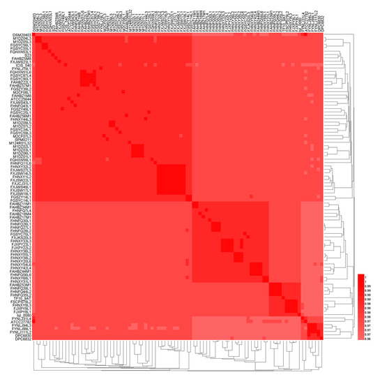 The average nucleotide identity (ANI) is a classical method for analyzing the unique species or potential subspecies existing among the strains within the same species. ANI values of those 91 genomes were carried out through pairwise comparison at the 95% threshold to further identify their species [44]. The results showed that all the 91 strains belonged to L. ruminis, and there was no potential subspecies for L. ruminis (Figure 3). The ANI values of L. ruminis strains from different sources were lower than that of strains from the same source.