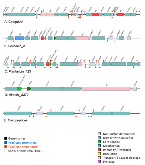 - van Heel, A.J.; de Jong, A.; Song, C.; Viel, J.H.; Kok, J.; Kuipers, O.P. BAGEL4: A user-friendly web server to thoroughly mine RiPPs and bacteriocins. Nucleic Acids Res. 2018, 46, W278–W281. [Google Scholar] [CrossRef] [PubMed]