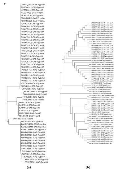 - Horvath, P.; Coute-Monvoisin, A.C.; Romero, D.A.; Boyaval, P.; Fremaux, C.; Barrangou, R. Comparative analysis of CRISPR loci in lactic acid bacteria genomes. Int. J. Food Microbiol. 2009, 131, 62–70. [Google Scholar] [CrossRef]