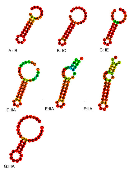 The number of spacer sequences in the CRISPR loci of different subtypes was analyzed (Figure.S1), whose number in the subtype IIA locus varied greatly, up to 66, at least five, with an average of about 24. The number of subtype IC spacer sequences was the lowest. Repeat sequences of the same type of CRISPR/Cas system showed high homology in the phylogenetic tree (Figure 8a). By predicting its secondary structure, repeat sequences can be better explored (Figure 9). The difference between the repeats of the types IB, IC, IE, and IIIA identified in L. ruminis were only a few base pair, with mainly the same frequency and secondary structure. Therefore, only one secondary structure was performed for the four types. Repeat sequences from the IIA subtype were more variable, with a total of three structures. When focusing on the RNA secondary structure of the repeat sequence of the CRISPR/Cas system in L. ruminis genomes, it was found that both ends of the repeat sequence contained a large loop and a small loop (Figure 9D–F), which was a typical stem-loop stable structure. Among these subtypes, IE and IIA contain G:U base pairs which were classical of conserved RNA secondary structures (Figure 9C–F). CRISPR/Cas loci onto the Cas1 tree demonstrated a considerable agreement between the phylogeny of Cas1 and locus types and subtypes (Figure 8b). Cas1 gene of subtype I-E was strictly monophyletic, while cas1 gene of subtype I-C, II-A and III-A was largely monophyletic, with a few exceptions.