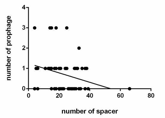 The prophages in the L. ruminis stains were predicted by PHASTER, and the results were listed in Table S4. Those prophages were predicted to be ‘intact’, ‘incomplete’ or ‘questionable’. Incomplete and questionable described the CDSs associated with the prophage gene cluster, but they did not correctly define prophage. Fifty-five intact prophages were identified in 40 out of 91 L. ruminis genomes (44%) (Table S4). Among them, 28 L. ruminis strains carried only one intact prophage, nine strains carried two prophages, and three strains carried three prophages. Interestingly, some prophage gene clusters which encoding structural and lysis components were identified as questionable or incomplete. In addition, by researching the correlation between the number of spacer sequences and the prophage, it was found that the relationship was negatively correlated in L. ruminis strains (Figure 10).