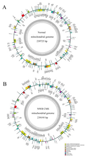 Organization of the normal (A) and NWB CMS (B) mitochondrial genomes. Genes on the forward and reverse strands are presented on the outside and inside of the circle, respectively. The two gray layers represent the GC content in the mitochondrial genome.