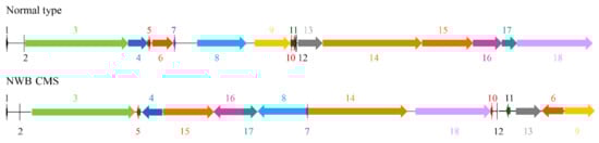 Comparison of the location and orientation of 18 syntenic regions between the NWB CMS and normal mitochondrial genomes.