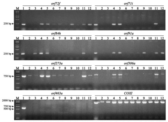 Amplification of seven candidate orf genes in 12 representative varieties. The CoxI gene was used as a positive control. Lanes 1–12 correspond to the following samples: YB-A, YB-B, Duanye 13 (South China), Qingbaoxia (Northwest China), YR Tengu (Japan), Xixing No. 5 (East China), Weiqing (East China), JZ Wujinhong (Northeast China), Manshenhong (West China), Banye Chunlihong (East China), Rudi (Netherlands), and Gang Shui (Northeast China).