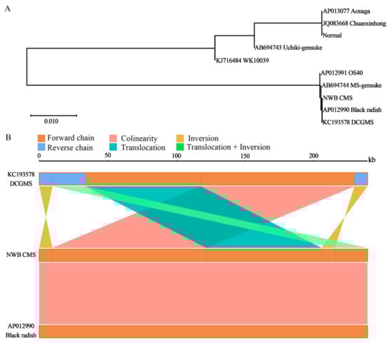 (A) Phylogenetic tree consisting of 10 radish mitotypes. The tree was constructed based on approximately 40-kb syntenic blocks. The optimal tree with a branch length sum of 0.129 is presented. The phylogenetic tree is drawn to scale, with branch lengths in the same units as those of the evolutionary distances used to construct the tree. (B) Analysis of syntenic sequences among the NWB CMS, DCGMS, and black radish (AP012990) lines. The three parallel bars represent the mitochondrial genomes. Dark-orange and blue regions in each bar represent the forward and reverse directions of the aligned genome, respectively. Lines between the two bars indicate the synteny types and locations as follows: magenta, blue-green, dark yellow, and light-green represent collinearity, translocation, inversion, and translocation + inversion, respectively.