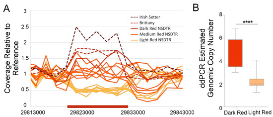 Relative coverage across the region of the KITLG CNV. (A) Relative coverage from paired-end whole-genome sequencing is plotted on the y-axis, and CanFam3.1 chr15 base pair position is plotted on the x-axis. The region of the CNV is marked by the red bar on the x-axis. Each line represents a single individual dog, and the color of the line represents the coat color of that dog. The solid lines represent NSDTR and the dashed lines represent Brittanys and an Irish Setter. (B) NSDTR comparison between light and dark dogs using digital droplet PCR to estimate the copy number. Comparison using a Mann–Whitney test. p = 4.1 × 10−11. Dark red, n = 28. Light red, n = 34. **** = highly significant.